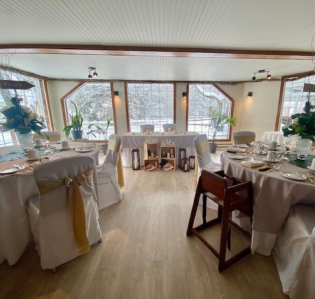 Repas et alcool sur place (rien de l'extérieur)Cette salle à un plafond à 2 niveaux et beaucoup de bois qui donne un look chic et rustique. Un beau luminaire style chandelier est au dessus de la piste de danse. Elle a aussi son bar privé et sa terrasse couverte avec vue sur notre petit lac et sa fontaine. Intime et chaleureuse sont deux mots qui la décrivent bien!