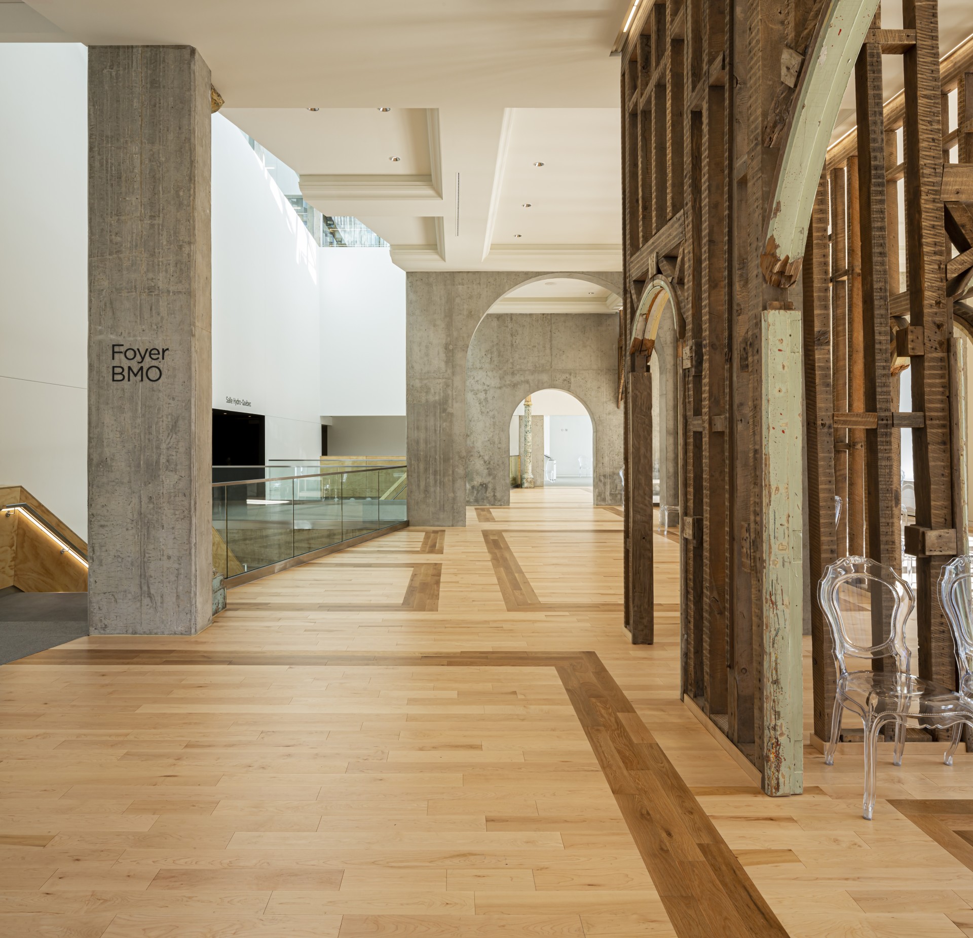 Le Foyer Desjardins vous permettra d’admirer un élément signature de l’architecture du Diamant : le mur rideau qui va du rez-de-chaussée jusqu’au dernier étage. Le bar principal du Diamant est situé à cet endroit. Le Foyer BMO rappelle quant à lui la fonction patrimoniale du lieu avec ses éléments évocateurs et théâtraux qui font référence à l’ancien YMCA. Différentes parties des murs originaux, incluant des boiseries et des colonnes en fontes, ont été récupérées au moment de la démolition, puis retravaillées pour devenir des éléments décoratifs.